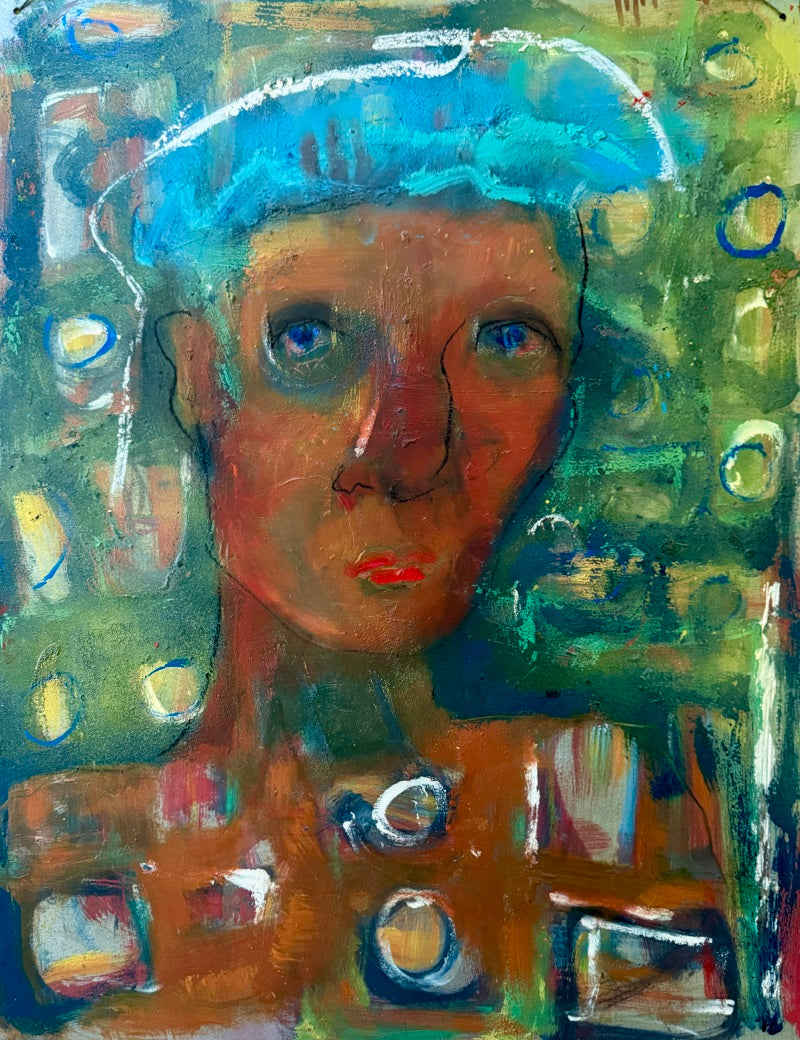It's painted on sheet metal with aerosol, raw pigments and oils, oil crayon and pencil.