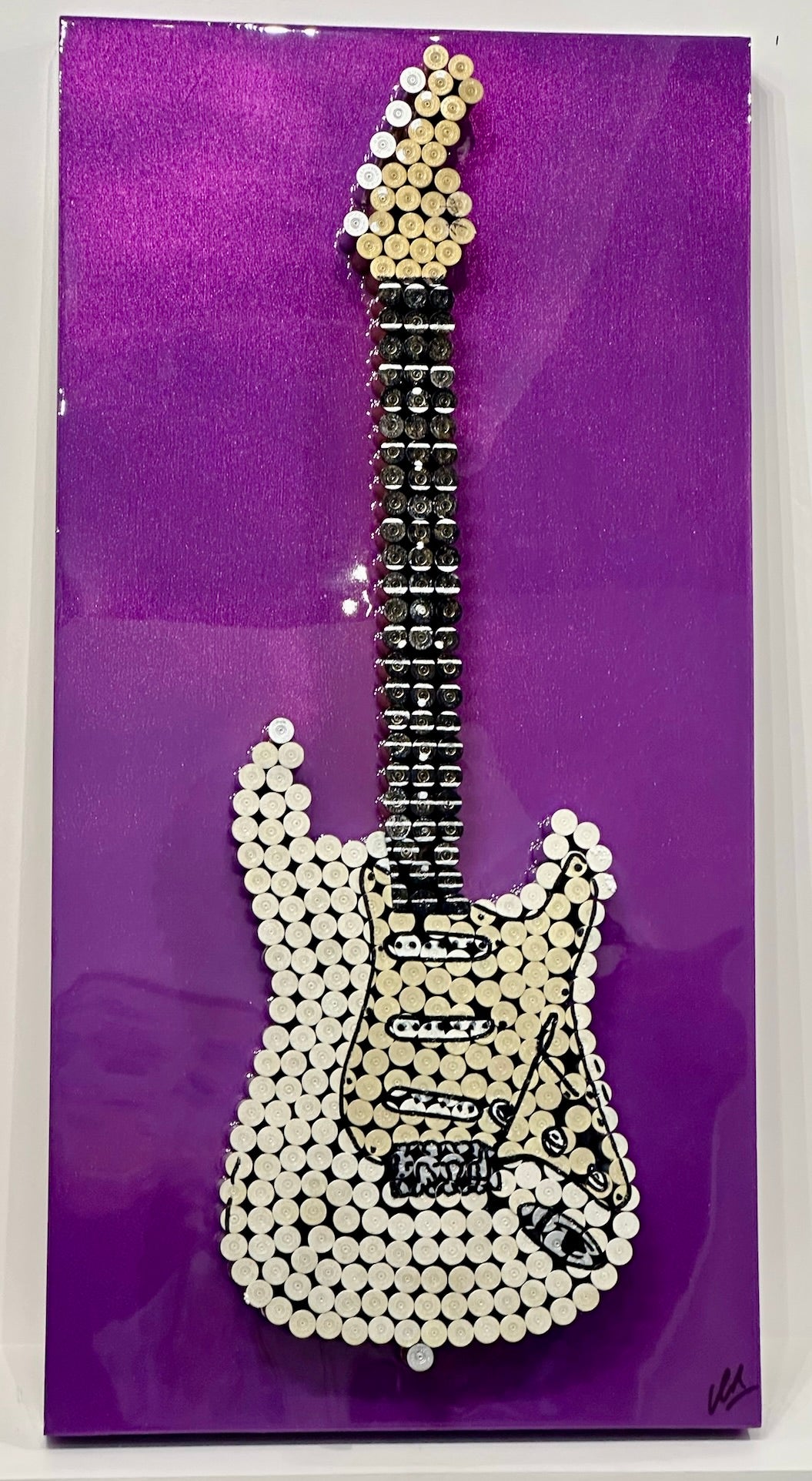 Mixed media with chrome-plated and painted shotgun shells, spray paint, resin on panel