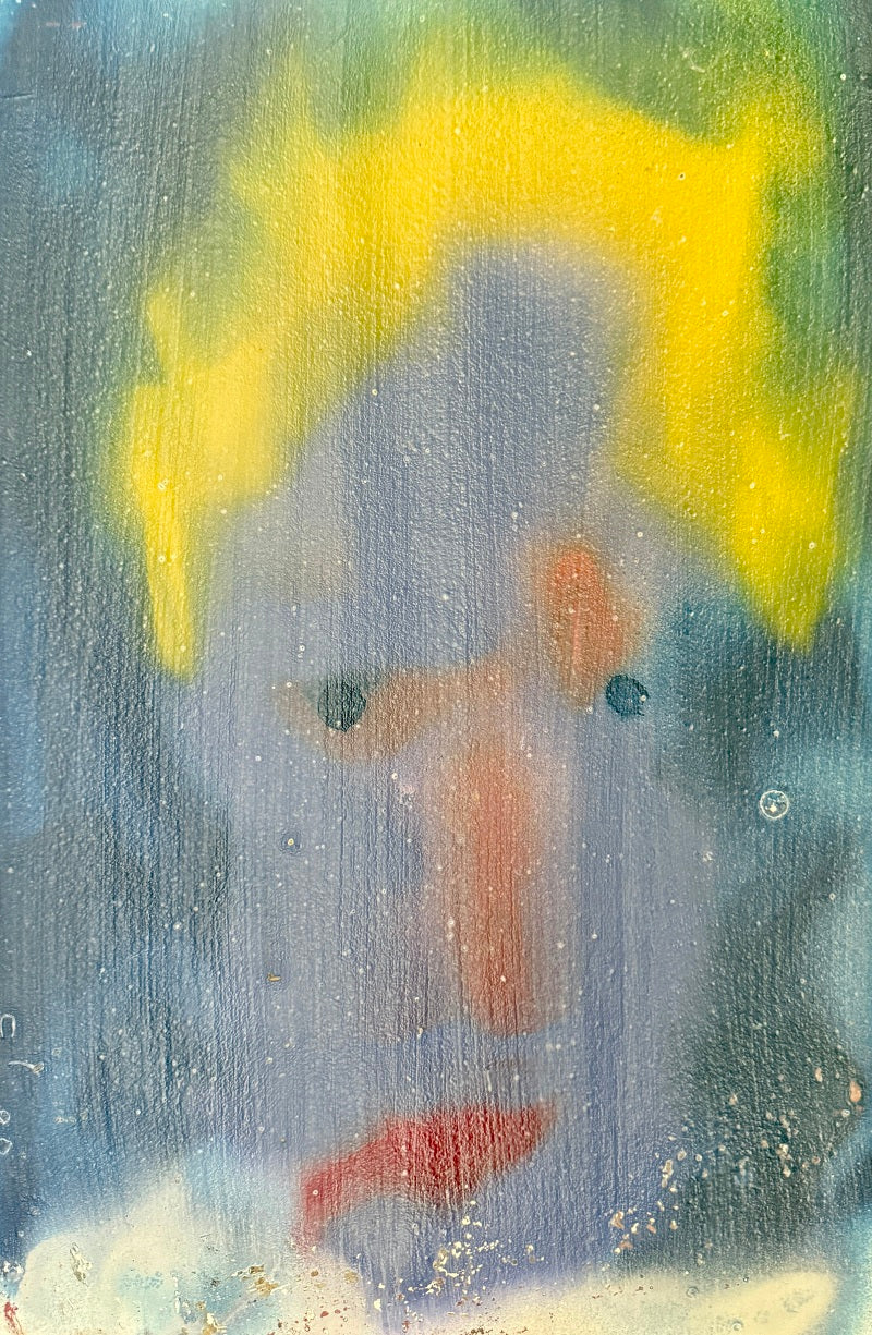 These memories are seen, as if, through frosted glass, fleeting wisps of the town I grew up in that I loved so much. They're done on recyclable synthetics with gouache, aerosol, water, ink, and oil crayon.