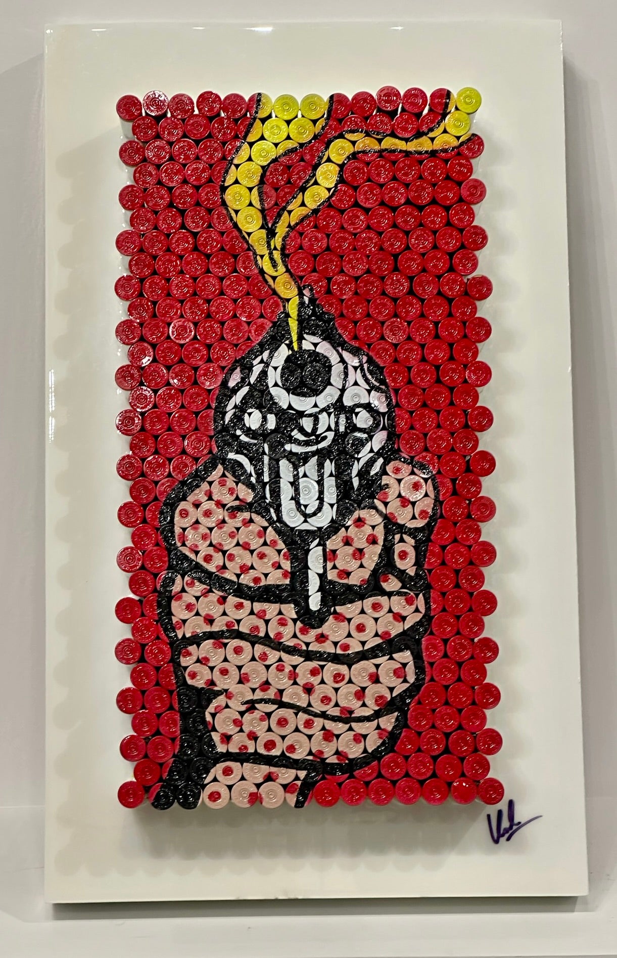 Mixed media with chrome-plated and painted shotgun shells, spray paint, resin on panel