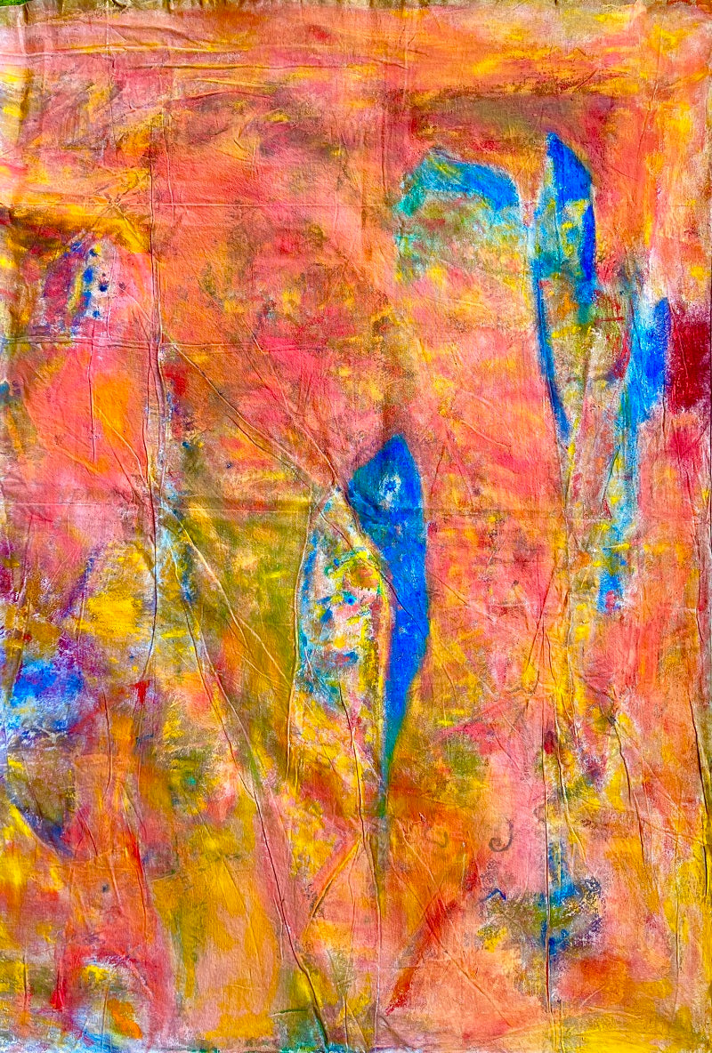 I used the same folding and creasing technique here, which adds to the texture of the water and light. It's hand-mixed pigments and ink on gessoed canvas.