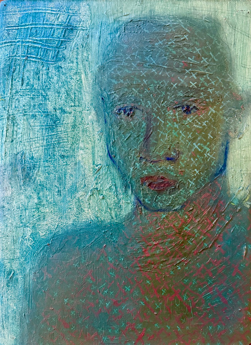 This piece will look different every time you see it, as the translucence of the paint reveals the texture and images that are painted underneath.