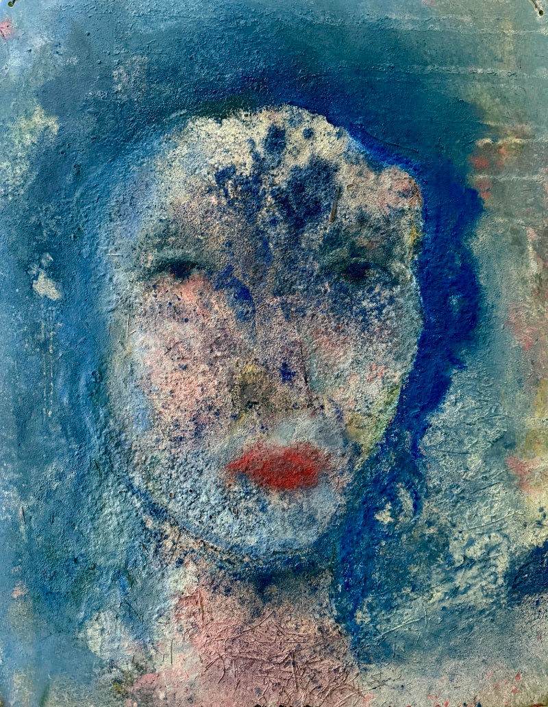 The red and orange underpainting is barely visible beyond the blues, greens, reds and pinks. This is one of the only paintings when I used the raw pigment still in powder form, it's visible in her hair, especially.